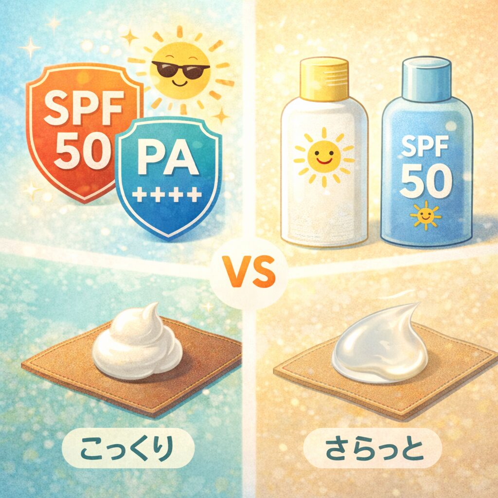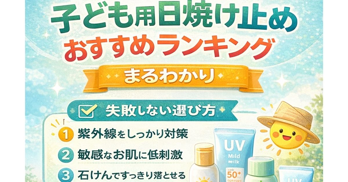 「子どもってすぐ焼けるけど、大丈夫かな…?」 外遊びが増える季節になると、こんな不安を感じる方も多いですよね。 私も最初は「子ども用じゃなくてもいいのでは?」と思って、大人用の日焼け止めを使っていました。でも実際に使ってみると… こんなことがあり、「これはちゃんと選ばないとダメだな」と感じました。 特に子どもの肌は大人よりもデリケート。 この記事では、そんな失敗を防ぐために 先に結論からお伝えします。 子ども用日焼け止めは、以下の条件を満たすものを選べば安心です。 この3つを満たしているものなら、日常使いで大きく失敗することはありません。 さらに、用途別で考えるとこんな感じです👇 「全部完璧なもの」を探すより、使うシーンに合わせるのがポイントです。 正直、最初はそこまで重要だと思っていませんでした。 でもある日、公園で長時間遊んだあと、子どもの腕がかなり赤くなってしまったんです。 そのときに初めて気づいたのが、 「子どもの肌ってこんなにダメージ受けやすいんだ…」 ということでした。 それからちゃんと日焼け止めを使うようにしたら、 と、かなり違いを感じました。 紫外線はすぐに影響が出るだけでなく、将来的な肌トラブルにもつながると言われています。 だからこそ、「今は大丈夫そう」ではなく、早めに対策しておくのが大切だと実感しています。 ここでは、最低限知っておきたいポイントをまとめます。 一番の違いは「肌へのやさしさ」です。 子ども用は、 といった特徴があります。 ただし数値が高いほどいいわけではありません。 👉 高い = 肌への負担も増える なので、 と使い分けるのがコツです。 ここは「使いやすさ」を優先してOKです。 ここまで理解できれば、選び方で大きく失敗することはありません。 ここからが一番大事です。 子ども用日焼け止めは、次の3つだけ意識すればOKです。 まずは紫外線対策としての基本。 ただし、ここで注意なのが「数値だけで選ばないこと」です。 さらに意外と大事なのが「テクスチャ」。 👉 ポイント 子ども用で一番重視したいポイントです。 特にチェックしたいのは👇 敏感肌の子どもは、ちょっとした成分でも刺激になることがあります。 👉 迷ったら「低刺激・シンプル成分」を選べばOKです。 意外と見落とされがちですが、かなり重要です。 落としにくい日焼け止めは、 ということもあります。 👉 ポイント かなりバランスのいい1本です。 メリット デメリット 👉 日常使いならこれで十分です。 メリット デメリット 👉 レジャーや外遊び多めの日におすすめ。 メリット デメリット メリット デメリット メリット デメリット メリット デメリット → 外に出る日は基本塗ったほうが安心です。 特に春〜夏は紫外線が強いので、短時間でも対策しておくと安心です。 → 商品によります。 「生後〇ヶ月〜」と書いてあるので必ず確認しましょう。 → はい、必要です。 目安は2〜3時間ごと。 → できれば避けたほうが安心です。 刺激が強い成分が入っていることがあります。 最後にタイプ別でまとめます。 → 低刺激+石けん落ちタイプ → SPF高めタイプ → ノンケミカル・無添加 子どもの肌は、大人よりずっとデリケートです。 だからこそ「なんとなく選ぶ」のではなく、 最初は1本でOKなので、 きっと「これなら安心」と思える1本が見つかりますよ。