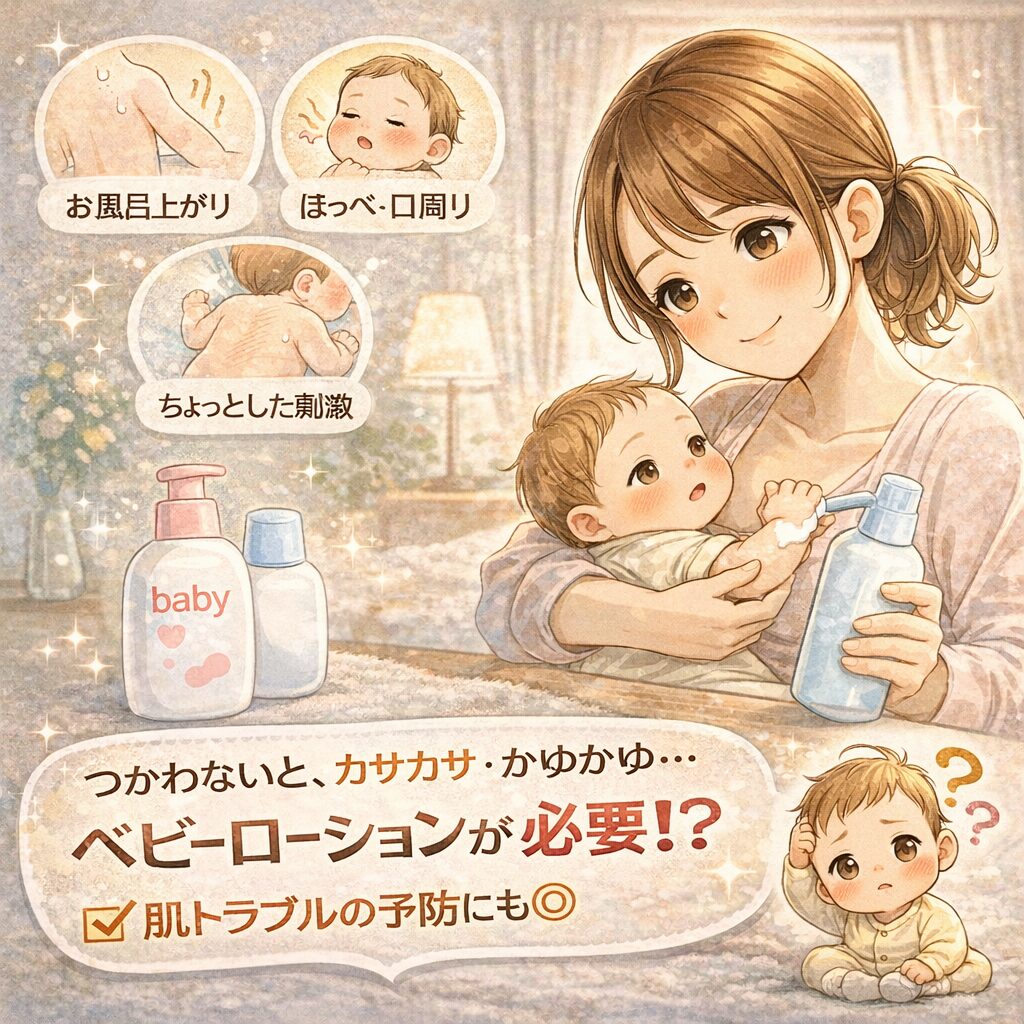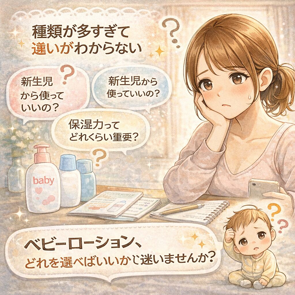 赤ちゃんのスキンケアを始めようと思ったとき、まず悩むのが「ベビーローション選び」ですよね。 私も最初はかなり迷いました。 さらに調べていくと、「無添加」「低刺激」「セラミド配合」など、聞き慣れない言葉も多くて混乱しがちです。 実際に使ってみないと分からない部分も多いので、 でも、赤ちゃんの肌はとてもデリケート。 ちょっとした乾燥や刺激が、肌トラブルにつながることもあります。 だからこそ、なんとなく選ぶのではなく、 先に結論からお伝えします。 ベビーローションは、次のポイントを満たすものを選べば失敗しにくいです。 特に意識したいのが「保湿力」です。 赤ちゃんの肌は水分を保つ力が弱く、すぐ乾燥しやすい状態です。 さらに、 こういった特徴があるものは、安心して使いやすいです。 迷ったときは、 正直、最初は「そこまで必要かな?」と思っていました。 でも実際に育児が始まると、 例えばこんな場面です。 特に驚いたのが、乾燥の早さ。 お風呂上がりに何も塗らないと、あっという間に肌が乾いてしまうんですよね。 そこからしっかり保湿するようになってからは、 といった変化を感じました。 また、保湿ケアを続けることで、 毎日のちょっとしたケアですが、その積み重ねが大切なんだと実感しました。 ここでは、最低限知っておきたいポイントをまとめます。 ベビーローションは、 特徴は、 といった点です。 それぞれ役割が少し違います。 季節や肌状態に合わせて使い分けるのがポイントです。 基本的には、 むしろ早い段階から保湿ケアをすることで、 ここまで理解できれば、基礎はOKです。 ベビーローション選びは難しそうに見えますが、見るポイントはシンプルです。 この3つを押さえておけば、安心して選べます。 まず一番大切なのがここです。 赤ちゃんの肌は乾燥しやすいので、 この両方が大事になります。 👉 塗ったあと「しっとり感が続くか」を意識しましょう。 赤ちゃんは自分で「しみる」「かゆい」と言えません。 だからこそ、 こういったものを選ぶのが安心です。 👉 迷ったら「低刺激・無添加寄り」を選べばOKです。 意外と大事なのが使いやすさです。 育児中は時間との勝負なので、 迷ったらまずこれ、というバランス型です。 メリット デメリット 👉 初めての1本としてかなり安心です。 メリット デメリット メリット デメリット メリット デメリット メリット デメリット メリット デメリット → はい、基本的に毎日使うのがおすすめです。 特にお風呂上がりは必須です。 → お風呂上がりすぐがベストです。 肌が乾く前に塗るのがポイントです。 → 少し多めくらいでOKです。 薄すぎると保湿効果が弱くなります。 → 基本的にはおすすめしません。 赤ちゃん用のほうが低刺激で安心です。 最後にタイプ別でまとめます。 → 高保湿タイプ+低刺激 → シンプル処方・無添加 → ワセリン配合など保湿重視 ベビーローションは、 最初から完璧を選ぶ必要はありません。 まずは使いやすそうなものから試してみて、 その小さな積み重ねが、